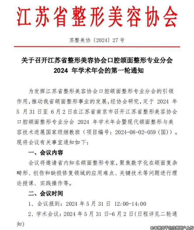 關于召開江蘇省整形美容協(xié)會口腔頜面整形專業(yè)分會2024年學術年會的第一輪通知