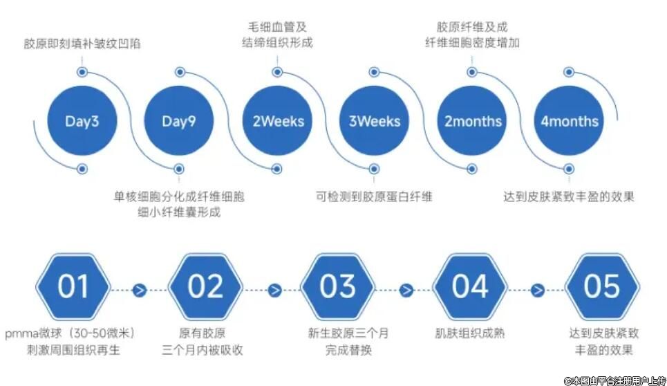 同時(shí),隨著時(shí)間推移膠原蛋白被吸收,PMMA微球支持自身膠原組織向內(nèi)生長(zhǎng),在皮膚中,細(xì)胞沉積新的膠原蛋白形成新的真皮基質(zhì),新組織形成與PMMA微球相結(jié)合,實(shí)現(xiàn)長(zhǎng)期美容矯正。