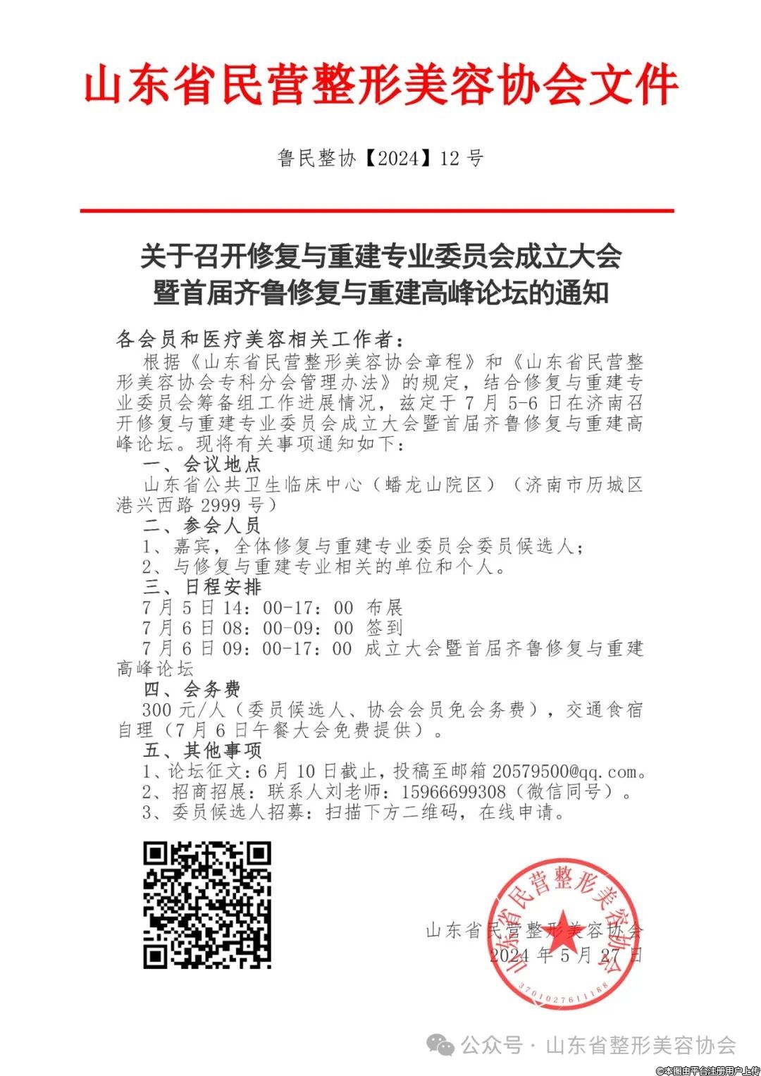 根據(jù)《山東省民營整形美容協(xié)會章程》和《山東省民營整形美容協(xié)會??品謺芾磙k法》的規(guī)定,結合修復與重建專業(yè)委員會籌備組工作進展情況,茲定于7月5-6日在濟南召開修復與重建專業(yè)委員會成立大會暨首屆齊魯修復與重建高峰論壇?,F(xiàn)將有關事項通知如下: