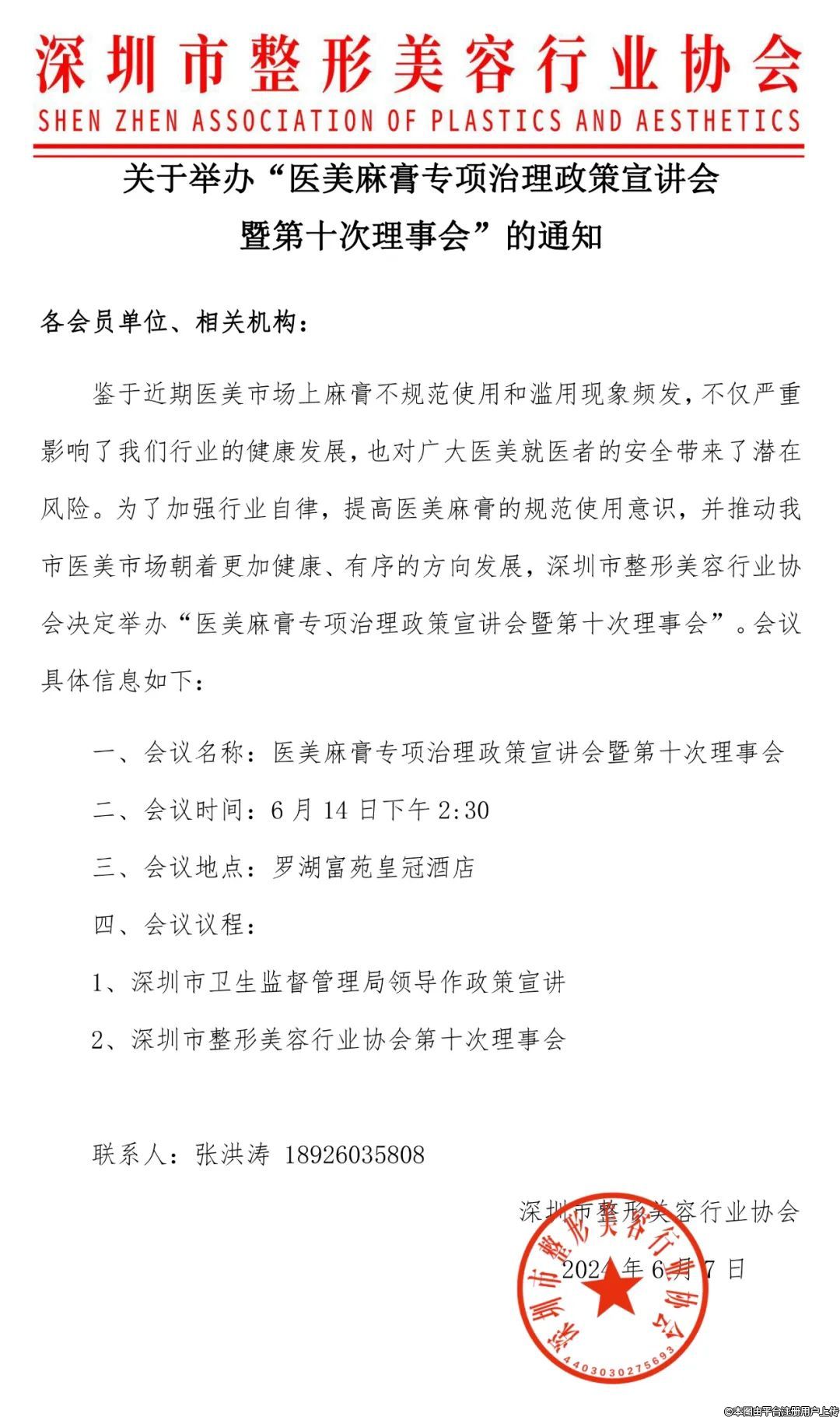 鑒于近期醫(yī)美市場(chǎng)上麻膏不規(guī)范使用和濫用現(xiàn)象頻發(fā),不僅嚴(yán)重影響了我們行業(yè)的健康發(fā)展,也對(duì)廣大醫(yī)美就醫(yī)者的安全帶來了潛在風(fēng)險(xiǎn)。為了加強(qiáng)行業(yè)自律,提高醫(yī)美麻膏的規(guī)范使用意識(shí),并推動(dòng)我市醫(yī)美市場(chǎng)朝著更加健康、有序的方向發(fā)展,深圳市整形美容行業(yè)協(xié)會(huì)決定舉辦“醫(yī)美麻膏專項(xiàng)治理政策宣講會(huì)暨第十次理事會(huì)”。