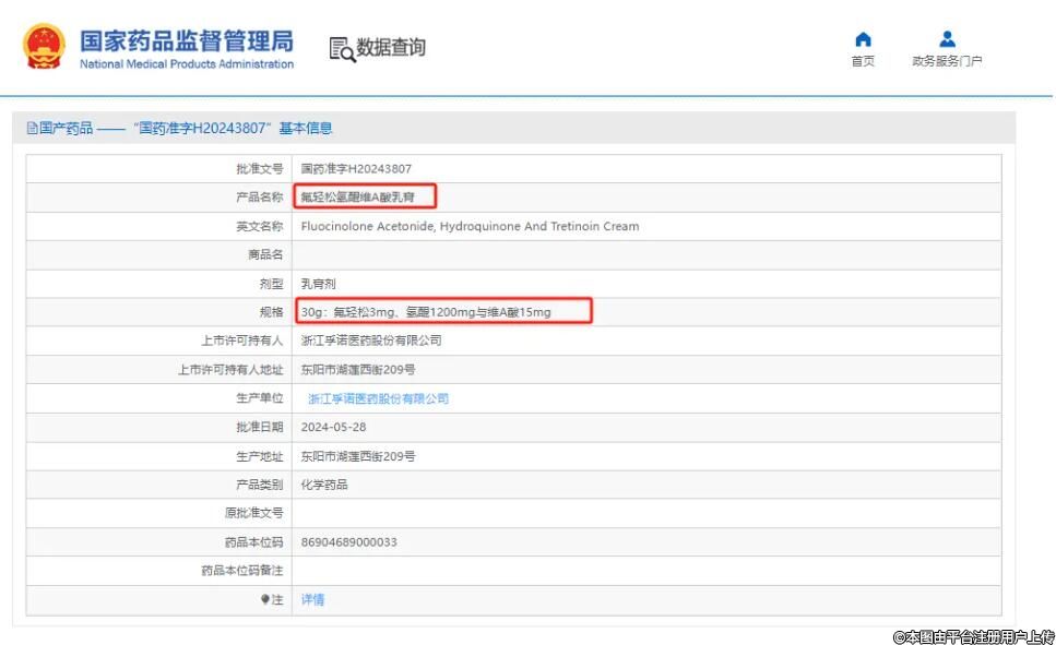 2024年5月28日,浙江孚諾醫(yī)藥股份有限公司旗下的孚美達(dá)®“氟輕松氫醌維A酸乳膏”正式獲國家藥監(jiān)局批準(zhǔn)上市,批準(zhǔn)文號:國藥準(zhǔn)字H20243807,成為國內(nèi)首個(gè)國產(chǎn)氟輕松氫醌維A酸乳膏。