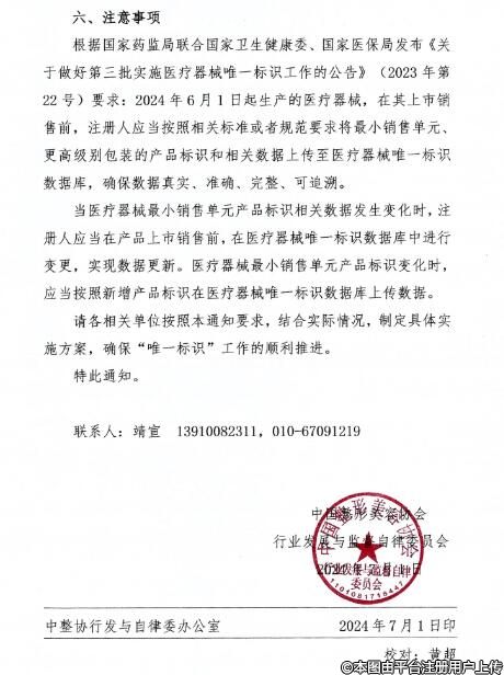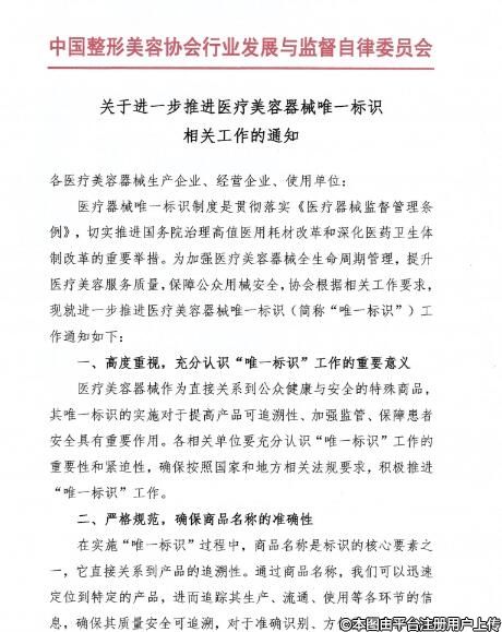 醫(yī)療器械唯一標(biāo)識制度是貫徹落實《醫(yī)療器械監(jiān)督管理條例》,切實推進國務(wù)院治理高值醫(yī)用耗材改革和深化醫(yī)藥衛(wèi)生體制改革的重要舉措。為加強醫(yī)療美容器械全生命周期管理,提升醫(yī)療美容服務(wù)質(zhì)量,保障公眾用械安全,協(xié)會根據(jù)相關(guān)工作要求,現(xiàn)就進一步推進醫(yī)療美容器械唯一標(biāo)識(簡稱“唯一標(biāo)識”)工作通知如下: