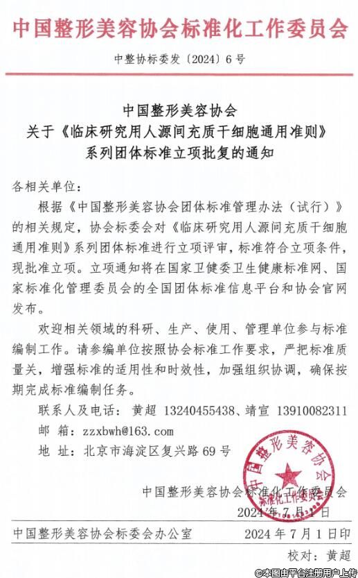 中國整形美容協(xié)會(huì)關(guān)于《臨床研究用人源間充質(zhì)干細(xì)胞通用準(zhǔn)則》系列團(tuán)體標(biāo)準(zhǔn)立項(xiàng)批復(fù)的通知