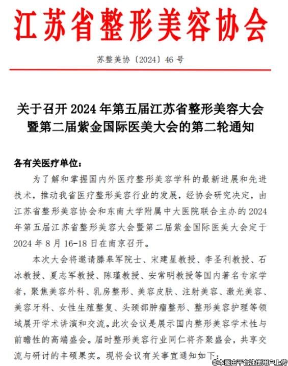 關(guān)于召開2024年第五屆江蘇省整形美容大會暨第二屆紫金國際醫(yī)美大會的第二輪通知