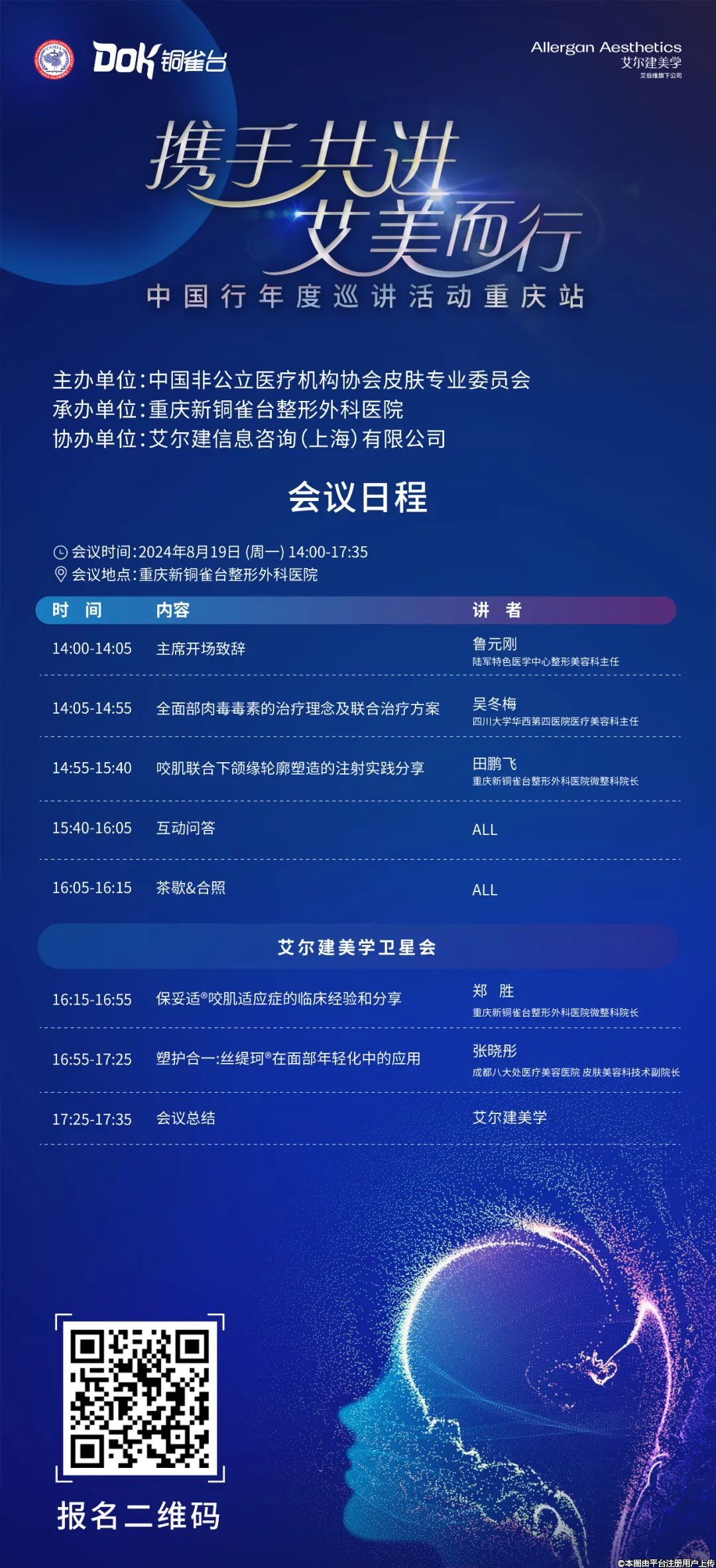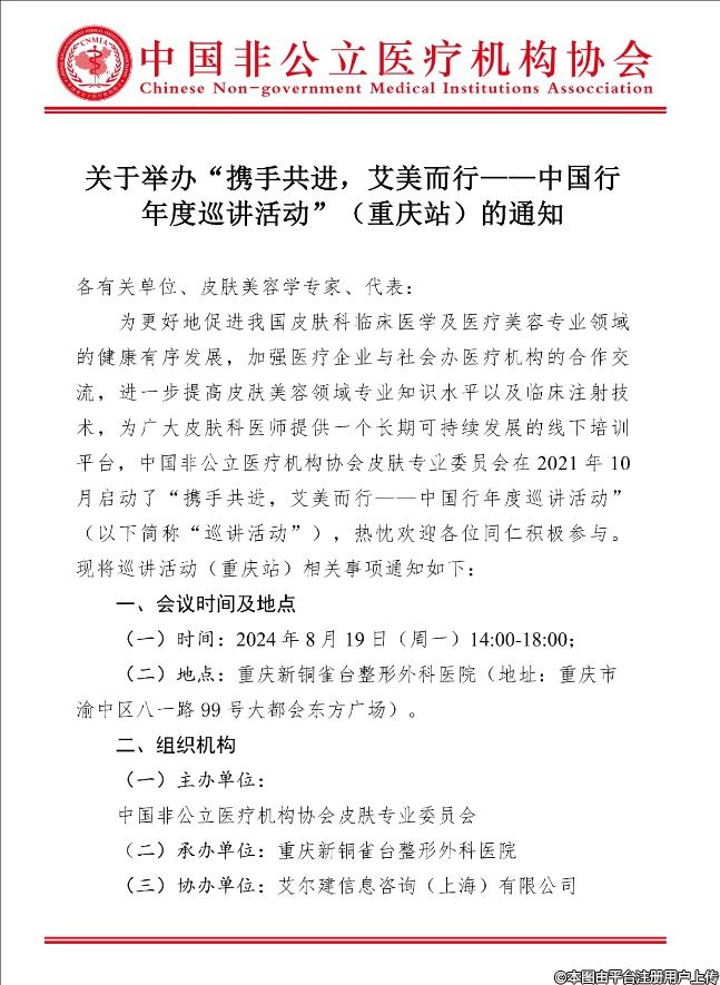 為更好地促進(jìn)我國皮膚科臨床醫(yī)學(xué)及醫(yī)療美容專業(yè)領(lǐng)域的健康有序發(fā)展,加強(qiáng)醫(yī)療企業(yè)與社會辦醫(yī)療機(jī)構(gòu)的合作交流,進(jìn)一步提高皮膚美容領(lǐng)域?qū)I(yè)知識水平以及臨床注射技術(shù),為廣大皮膚科醫(yī)師提供一個(gè)長期可持續(xù)發(fā)展的線下培訓(xùn)平臺,中國非公立醫(yī)療機(jī)構(gòu)協(xié)會皮膚專業(yè)委員會在2021年10月啟動了“攜手共進(jìn),艾美而行——中國行年度巡講活動”(以下簡稱“巡講活動”),熱忱歡迎各位同仁積極參與?,F(xiàn)將巡講活動(重慶站)相關(guān)事項(xiàng)通知如下:
