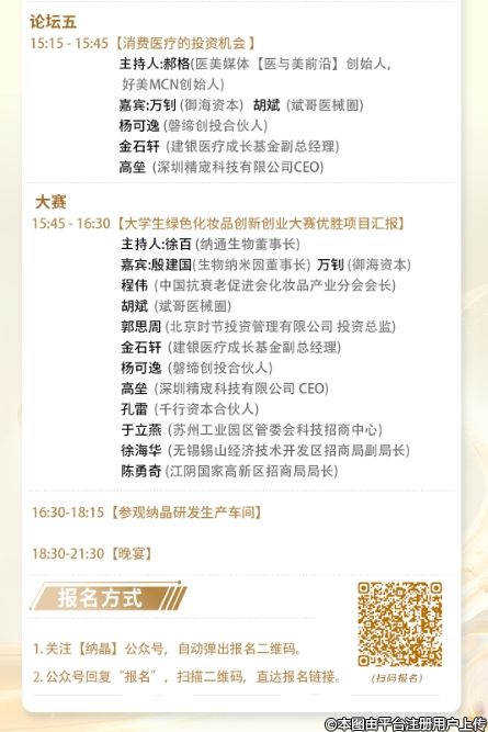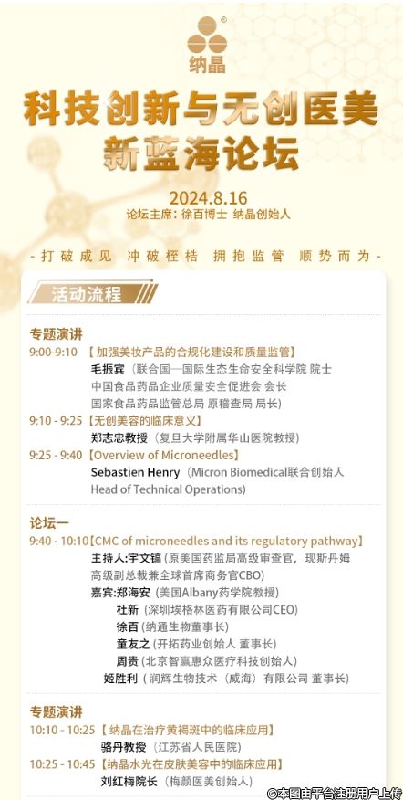 本次論壇匯聚了生物醫(yī)藥、醫(yī)療美容、美容護(hù)膚、政府監(jiān)管、大健康抗衰老、品牌營銷、消費(fèi)醫(yī)療投資等領(lǐng)域的專家,旨在分享最新的行業(yè)洞見和技術(shù)創(chuàng)新,為您的機(jī)構(gòu)提供安全、合法、有效的解決方案。通過真實(shí)案例分析,特別是納晶的成功實(shí)踐,幫助大家了解國家強(qiáng)監(jiān)管是美容產(chǎn)業(yè)科技創(chuàng)新最大的戰(zhàn)略機(jī)遇,并探討如何擁抱監(jiān)管,實(shí)現(xiàn)合法合規(guī)的長期盈利。