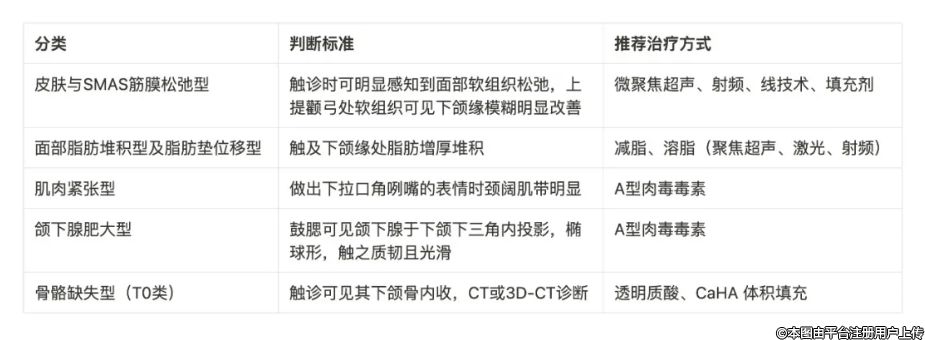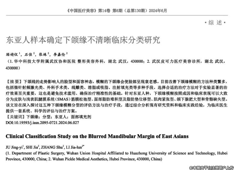 摘要:下頜線的走勢影響人的臉型和面容神態(tài),模糊的下頜緣會使臉部呈現(xiàn)衰老感。目前改善下頜緣模糊的方法種類繁多,包括微針射頻激光“類、外科手術類、線雕類、溶脂或吸脂、注射填充類等多種手段。選擇合適的治療方法對于實驗顯著的治療效果至關重要,這也是避免技術濫用、確保治療精準性的基礎。針對東亞人種,下頜緣模糊按照成因和臨床表現(xiàn)可以大致分為皮膚與淺表肌腱膜系統(tǒng)(SMAS)筋膜松弛型、面部脂肪堆積型及脂肪墊位移型、肌肉緊張型、頜下腺肥大型和骨骼缺失型。該文旨在深入探討這五種下頜緣模糊分型的評估方法與治療手段,通過綜合分析現(xiàn)有研究資料和臨床實踐經驗,為臨床醫(yī)生提供一套系統(tǒng)、科學的評估與治療方案。