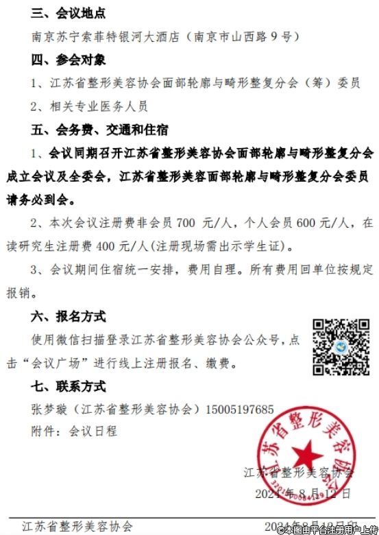 為發(fā)揮江蘇省整形美容協(xié)會(huì)面部輪廓與畸形整復(fù)分會(huì)(籌)的引領(lǐng)作用,推動(dòng)我省面部輪廓與畸形整復(fù)診療事業(yè)的發(fā)展,經(jīng)協(xié)會(huì)研究,由江蘇省整形美容協(xié)會(huì)主辦、南京市第二醫(yī)院承辦的面部輪廓與畸形整復(fù)分會(huì)(籌)2024年學(xué)術(shù)年會(huì)暨面部輪廓整形新進(jìn)展繼續(xù)教育學(xué)習(xí)班定于2024年8月30-31日在南京召開(kāi)?,F(xiàn)將會(huì)議有關(guān)事宜通知如下: