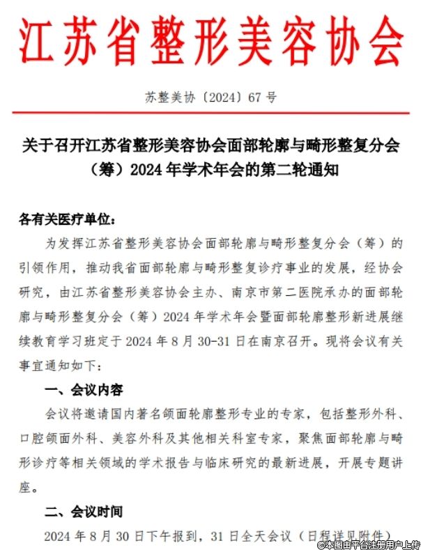 關(guān)于召開(kāi)江蘇省整形美容協(xié)會(huì)面部輪廓與畸形整復(fù)分會(huì)(籌)2024年學(xué)術(shù)年會(huì)的第二輪通知