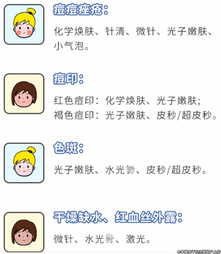 不同儀器不同模式能改善膚質(zhì)、淡化細紋、色斑、改善痘痘、淡化痘印、治療紅血絲等,價格也親民。