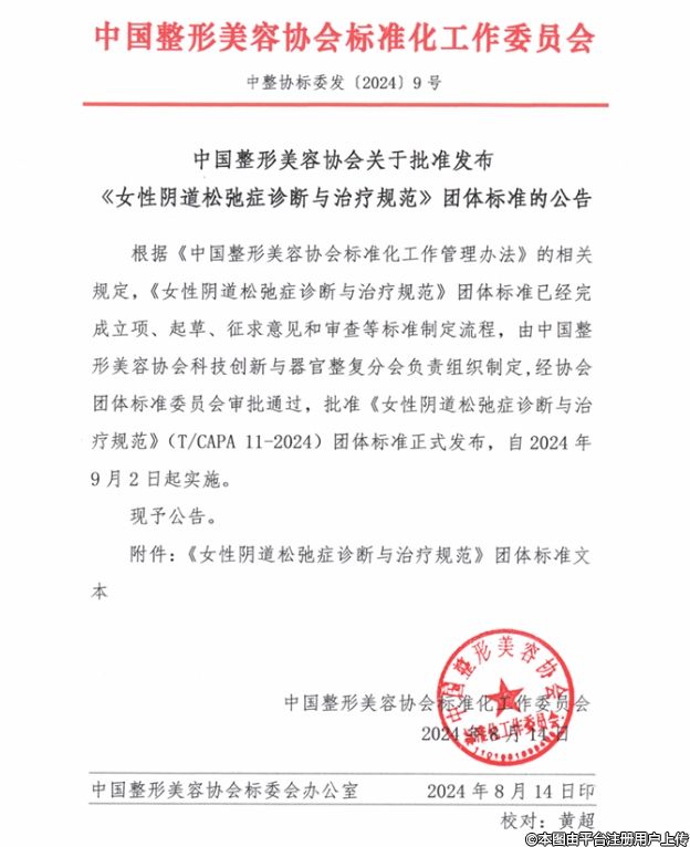 根據(jù)《中國(guó)整形美容協(xié)會(huì)標(biāo)準(zhǔn)化工作管理辦法》的相關(guān)規(guī)定,《女性陰道松弛癥診斷與治療規(guī)范》團(tuán)體標(biāo)準(zhǔn)已經(jīng)完成立項(xiàng)、起草、征求意見(jiàn)和審查等標(biāo)準(zhǔn)制定流程,由中國(guó)整形美容協(xié)會(huì)科技創(chuàng)新與器官整復(fù)分會(huì)負(fù)責(zé)組織制定,經(jīng)協(xié)會(huì)團(tuán)體標(biāo)準(zhǔn)委員會(huì)審批通過(guò),批準(zhǔn)《女性陰道松弛癥診斷與治療規(guī)范》(T/CAPA 11-2024)團(tuán)體標(biāo)準(zhǔn)正式發(fā)布,自2024年9月2日起實(shí)施。