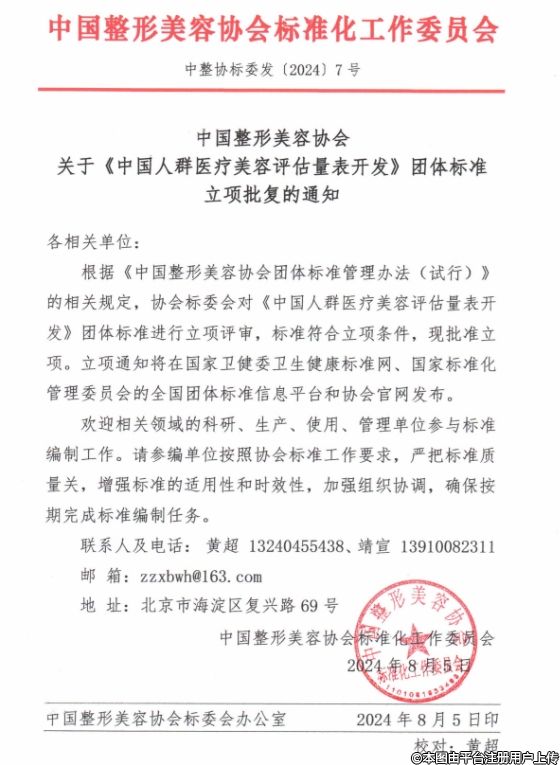 根據(jù)《中國整形美容協(xié)會團(tuán)體標(biāo)準(zhǔn)管理辦法(試行)》的相關(guān)規(guī)定,協(xié)會標(biāo)委會對《中國人群醫(yī)療美容評估量表開發(fā)》團(tuán)體標(biāo)準(zhǔn)進(jìn)行立項評審,標(biāo)準(zhǔn)符合立項條件,現(xiàn)批準(zhǔn)立項。立項通知將在國家衛(wèi)健委衛(wèi)生健康標(biāo)準(zhǔn)網(wǎng)、國家標(biāo)準(zhǔn)化管理委員會的全國團(tuán)體標(biāo)準(zhǔn)信息平臺和協(xié)會官網(wǎng)發(fā)布。
