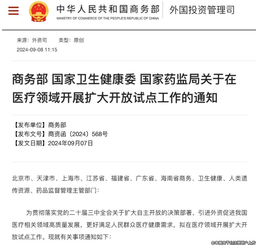 商務部、國家衛(wèi)生健康委、國家藥監(jiān)局9月8日對外發(fā)布《關于在醫(yī)療領域開展擴大開放試點工作的通知》,擬允許在北京、天津、上海、南京、蘇州、福州、廣州、深圳和海南全島設立外商獨資醫(yī)院,但中醫(yī)類除外,也不包括并購公立醫(yī)院。設立外商獨資醫(yī)院的具體條件、要求和程序等將另行通知。