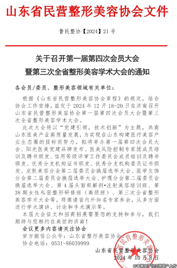 根據(jù)《山東省民營(yíng)整形美容協(xié)會(huì)章程》的規(guī)定,結(jié)合協(xié)會(huì)工作安排,茲定于2024年12月18-20日在濟(jì)南召開山東省民營(yíng)整形美容協(xié)會(huì)第一屆第四次會(huì)員大會(huì)暨第三次全省整形美容學(xué)術(shù)大會(huì)。