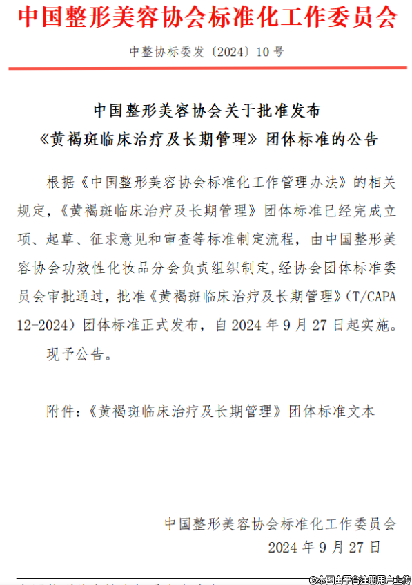 《黃褐斑臨床治療及長期管理》團體標準的公告根據(jù)《中國整形美容協(xié)會標準化工作管理辦法》的相關規(guī)定,《黃褐斑臨床治療及長期管理》團體標準已經(jīng)完成立項、起草、征求意見和審查等標準制定流程,由中國整形美容協(xié)會功效性化妝品分會負責組織制定,經(jīng)協(xié)會團體標準委員會審批通過,批準《黃褐斑臨床治療及長期管理》(T/CAPA12-2024)團體標準正式發(fā)布,自2024年9月27日起實施。