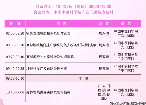 3、10月26-27日為學(xué)習(xí)班培訓(xùn)課程,以授課及實(shí)操為主,內(nèi)容包含中醫(yī)美容外治技術(shù),穴位埋線技術(shù),微針治療,化學(xué)換膚術(shù),脫發(fā)非藥物治療等,配置 6-7 名輔導(dǎo)老師,做到每個(gè)學(xué)員親自實(shí)操,培訓(xùn)結(jié)束后頒發(fā)中國(guó)整形美容協(xié)會(huì)培訓(xùn)證書。