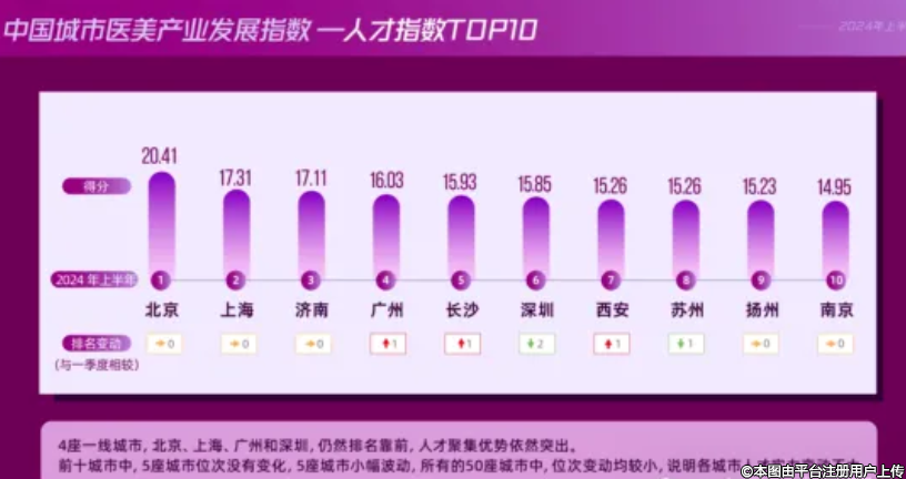 北京、上海、濟(jì)南排名前三,與上期相比沒(méi)有發(fā)生變化,深圳下降兩位,被廣州和長(zhǎng)沙反超。廣州、長(zhǎng)沙、西安、南昌、鄭州、泉州 6 城人才指數(shù)排名連續(xù)三期不斷上升,對(duì)醫(yī)美產(chǎn)業(yè)人才的吸引力越來(lái)越大。這表明這些城市在醫(yī)美人才的引進(jìn)和培養(yǎng)方面做出了積極努力。