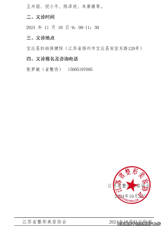 為貫徹落實(shí)黨中央健康中國(guó)戰(zhàn)略和國(guó)務(wù)院《全民科學(xué)素質(zhì)行動(dòng)計(jì)劃綱要》,發(fā)揮協(xié)會(huì)為民服務(wù)的宗旨,利用協(xié)會(huì)專(zhuān)家資源為基層提供醫(yī)療技術(shù)支持,推動(dòng)當(dāng)?shù)蒯t(yī)學(xué)科學(xué)發(fā)展和人才培養(yǎng),提高當(dāng)?shù)厝嗣袢罕姷慕】狄庾R(shí)和健康水平,由江蘇省整形美容協(xié)會(huì)主辦、江蘇省整形美容協(xié)會(huì)面部輪廓與畸形分會(huì)、寶應(yīng)縣婦幼保健院聯(lián)合承辦的專(zhuān)家義診定于2024年11月10 日在寶應(yīng)縣婦幼保健院舉辦,歡迎各位同仁的關(guān)注和參加。義診安排如下: