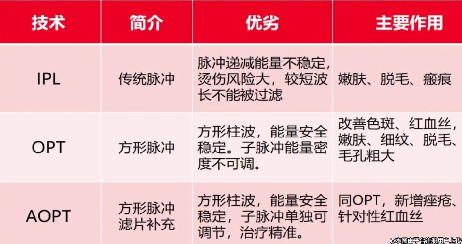 AOPT技術是升級版OPT,升級之處在于,子脈沖能量的密度可調,實現(xiàn)“每個子脈沖能量密度可單獨調節(jié)”的升級,有效增強了能量的控制。AOPT增加了紅血絲和痤瘡針對性濾片。治療參數可調節(jié),治療范圍也更大。但由于自由度太高,參數調節(jié)完全依賴醫(yī)生的經驗和技術,治療效果可能會出現(xiàn)兩極分化。