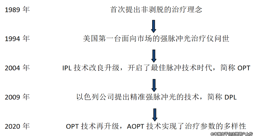這與強脈沖光的技術迭代密切相關,縱觀強脈沖光的發(fā)展史: