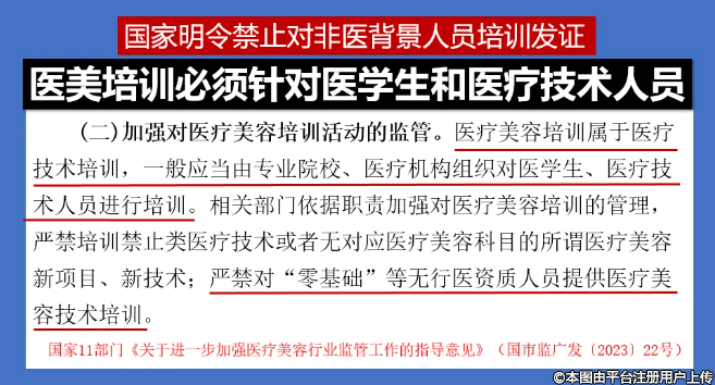 “相應醫(yī)師資質(zhì)”是指具有醫(yī)療美容相關(guān)專業(yè)的執(zhí)業(yè)醫(yī)師資格證等;“相應醫(yī)學藥學知識”是指具有國家認可的醫(yī)學類學歷、美容醫(yī)學專業(yè)培訓等證書。目前任何單位頒發(fā)的美學設(shè)計師或醫(yī)美咨詢師證書只能作為職業(yè)能力培訓證明,并非合法從業(yè)資質(zhì)。而且根據(jù)國家11部門監(jiān)管規(guī)定,其培訓對象也必須具備醫(yī)學背景,否則其培訓活動屬違規(guī)行為!