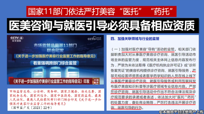 根據(jù)國家11部門監(jiān)管要求,從事醫(yī)美咨詢與就醫(yī)引導服務,必須具備相應醫(yī)師資質(zhì)或者相應醫(yī)學藥學知識,否則就是國家要依法嚴厲打擊的“醫(yī)托”“藥托”!因此,相關(guān)從業(yè)人員必須具備可供查驗的相應資質(zhì)。