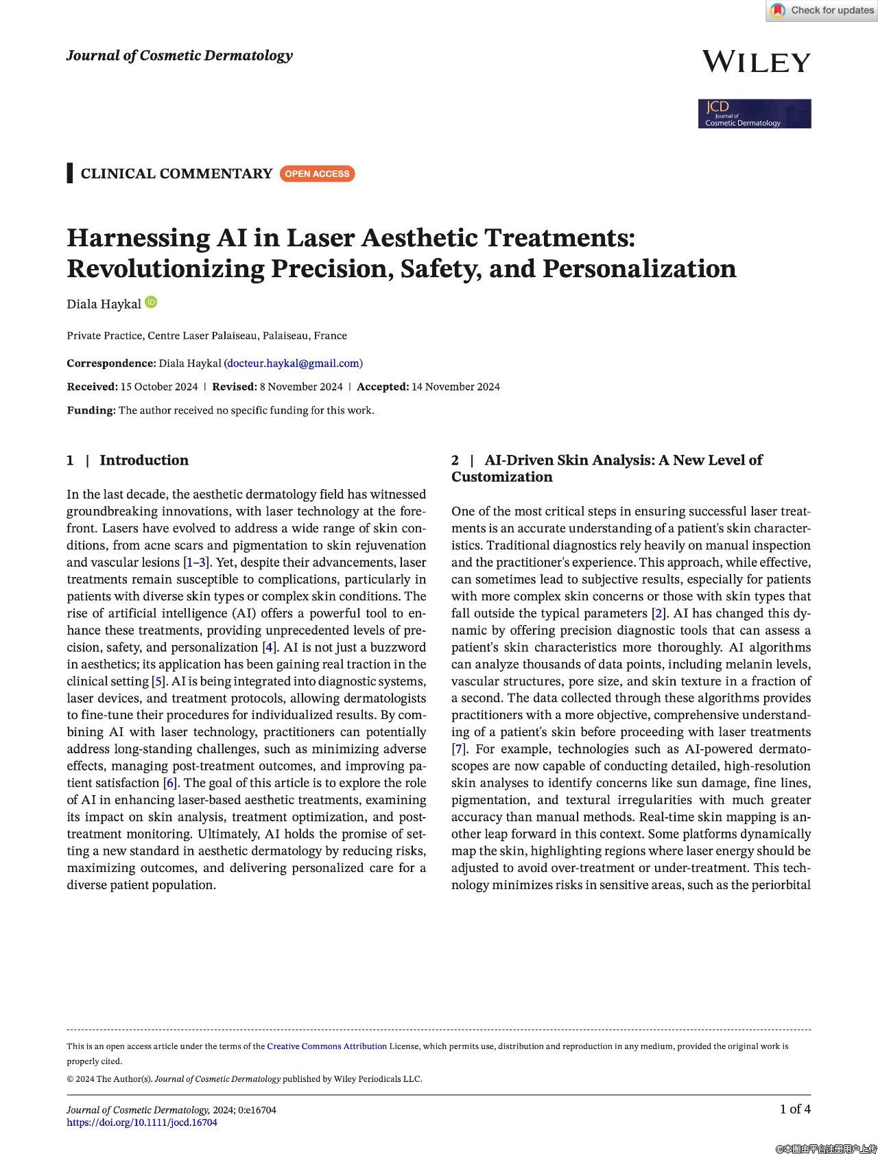 過去十年間,美容皮膚科領(lǐng)域因激光技術(shù)的創(chuàng)新而發(fā)生了顯著變革,激光技術(shù)始終處于該領(lǐng)域發(fā)展的前沿。激光已逐漸發(fā)展成為一種能夠有效治療多種皮膚狀況的手段,其應(yīng)用范圍涵蓋了從痤瘡疤痕、色素沉著到皮膚年輕化以及血管病變等諸多方面。雖然激光技術(shù)取得了長足的進步,但在實際應(yīng)用中,激光治療并非毫無風(fēng)險,尤其是在面對皮膚類型各異或者皮膚狀況較為復(fù)雜的患者時,仍然容易出現(xiàn)各種并發(fā)癥。人工智能(AI)技術(shù)的興起,為改善激光治療效果提供了一種極具潛力的強大工具。AI 技術(shù)的應(yīng)用能夠在激光治療過程中提供前所未有的高精度、高安全性以及高度個體化的治療方案。如今在醫(yī)美領(lǐng)域,人工智能已經(jīng)不再只是一個熱門的流行詞匯,其在臨床實踐中的應(yīng)用正逐漸獲得實質(zhì)性的進展和廣泛的認可。目前,人工智能技術(shù)正在逐步融入到診斷系統(tǒng)、激光設(shè)備以及治療方案等各個環(huán)節(jié)之中,這使得醫(yī)生能夠更加精細地調(diào)整治療程序,為每一位患者提供更加個體化的治療結(jié)果。將人工智能技術(shù)與激光技術(shù)結(jié)合,有望克服激光治療長期面臨的諸多挑戰(zhàn),例如如何最大程度地減少治療過程中的不良反應(yīng)、如何更加有效地管理治療后的效果以及如何顯著提高患者對治療的滿意度等。本文旨在深入探討人工智能技術(shù)在提升激光美容治療效果方面可能發(fā)揮的重要作用,詳細論述其對皮膚分析、治療優(yōu)化以及治療后監(jiān)測等環(huán)節(jié)的深遠影響。人工智能技術(shù)有望通過降低治療風(fēng)險、最大化治療效果以及為不同患者群體提供更加個性化的護理服務(wù),在美容皮膚治療領(lǐng)域樹立全新標(biāo)準(zhǔn)。