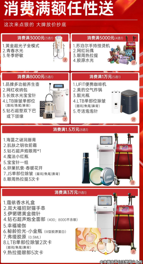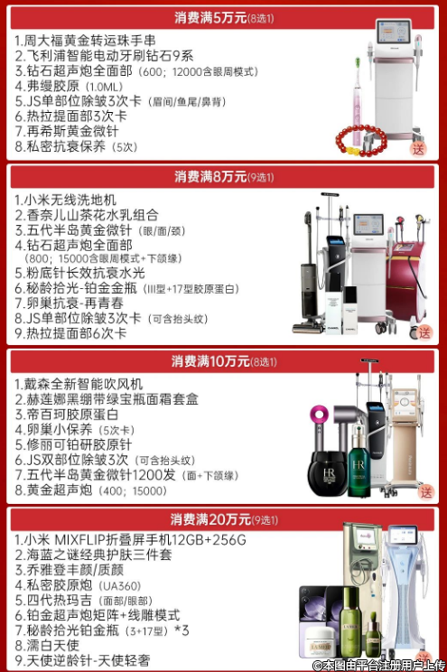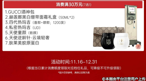 天使逆齡針、熱瑪吉、超聲炮、黃金超光子全模式、咖啡機、周大福黃金轉運珠、海藍之謎護膚三件套、赫蓮娜黑白繃帶面霜禮盒GUCCI酒神包等等滿額消費,放肆送!
