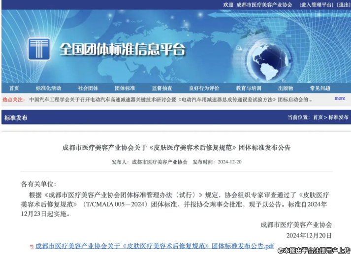 2024年12月20日,成都市醫(yī)療美容產(chǎn)業(yè)協(xié)會(huì)組織專(zhuān)家審查通過(guò)了《皮膚醫(yī)療美容術(shù)后修復(fù)規(guī)范》團(tuán)體標(biāo)準(zhǔn),為醫(yī)美行業(yè)的健康發(fā)展提供了重要指導(dǎo),旨在提升行業(yè)整體服務(wù)水平,切實(shí)保障求美者權(quán)益。