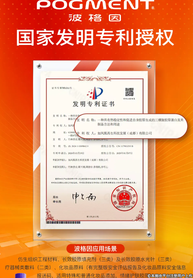 在膠原市場“內(nèi)卷”愈演愈烈的現(xiàn)狀下,波格因三螺旋仿生膠原憑借“交叉學(xué)科+創(chuàng)新技術(shù)”范式脫穎而出,為傳統(tǒng)膠原材料的不足提供了全新的解決方案。通過強(qiáng)化材料力學(xué)性能并優(yōu)化生物活性,其技術(shù)成果成功樹立了膠原行業(yè)的新標(biāo)桿。而此次國家發(fā)明專利的授予,更是強(qiáng)有力地印證了如鳳凰在膠原再生領(lǐng)域的技術(shù)領(lǐng)先地位與創(chuàng)新實力。