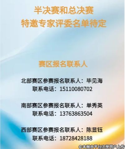 所有參賽單位和個人上報材料,將由大會學(xué)術(shù)秘書處進(jìn)行初步篩選審核,初篩后由專家進(jìn)行評分,最后評選出每個半決賽區(qū)前15名單位和個人進(jìn)入半決賽。