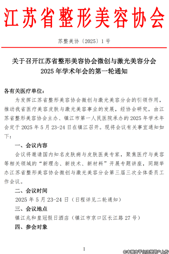 關(guān)于召開江蘇省整形美容協(xié)會微創(chuàng)與激光美容分會2025年學(xué)術(shù)年會的第一輪通知