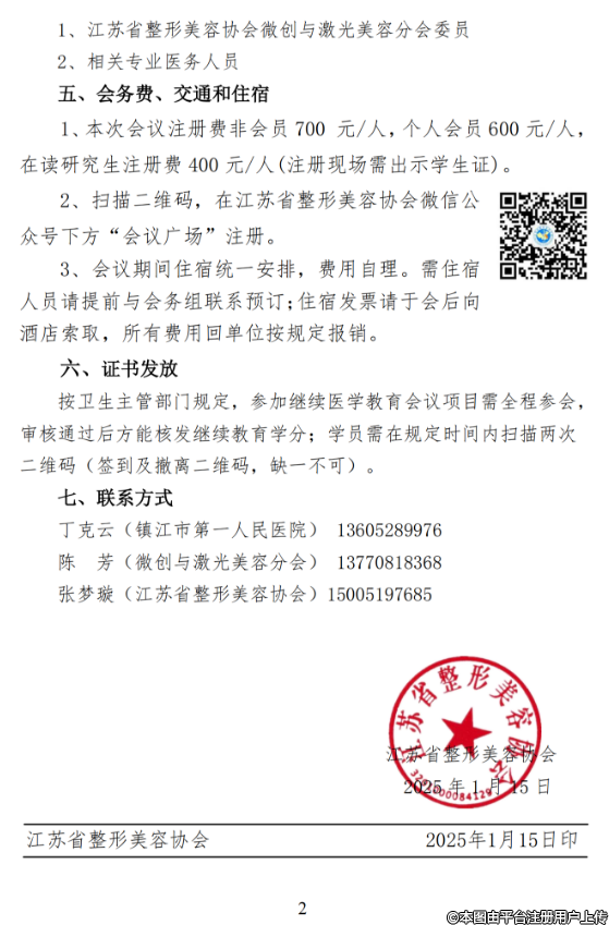 為發(fā)揮江蘇省整形美容協(xié)會微創(chuàng)與激光美容分會的引領(lǐng)作用,推動我省醫(yī)療美容皮膚與激光美容事業(yè)的發(fā)展,經(jīng)協(xié)會研究,由江蘇省整形美容協(xié)會主辦、鎮(zhèn)江市第一人民醫(yī)院承辦的 2025 年學(xué)術(shù)年會定于 2025 年5月23-24 日在鎮(zhèn)江召開?,F(xiàn)將會議有關(guān)事宜通知如下: