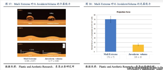 根據(jù)Plastic and Aesthetic Research和東吳證券研究所報告,在與艾爾健喬雅登品牌的Juvéderm Voluma的對比試驗中,應(yīng)用OxiFree?專利技術(shù)的透明質(zhì)酸凝膠產(chǎn)品MaiLi?Extreme的豐盈程度高出34%,與此同時MaiLi?Extreme所需注射的凝膠減少了24%。