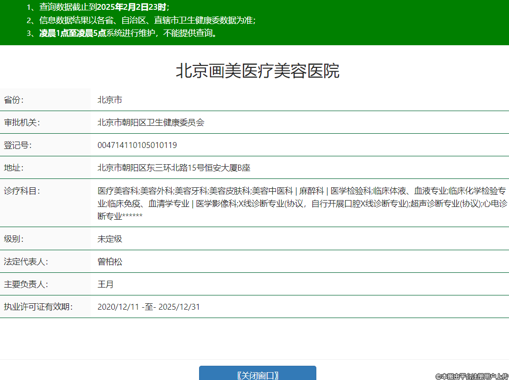 北京畫美醫(yī)療美容成立于2004年,是當(dāng)?shù)乩吓频尼t(yī)療美容機(jī)構(gòu)。小編還在衛(wèi)健委官網(wǎng)查詢到了其資質(zhì),確實(shí)是正規(guī)的整形美容??漆t(yī)院。具體查詢結(jié)果也為大家放上了,請看▼