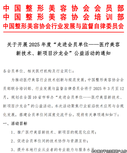 各會員單位、相關醫(yī)療機構及行業(yè)同仁:為推動醫(yī)療美容行業(yè)技術創(chuàng)新與規(guī)范發(fā)展,中國整形美容協(xié)會會員部聯(lián)合培訓部、行業(yè)發(fā)展與監(jiān)督自律委員會將于2025年3月至12月,規(guī)劃在全國10省市舉辦“走進會員單位--醫(yī)療美容新技術、新項目沙龍會”的公益活動。本次活動聚焦行業(yè)前沿技術應用與合規(guī)化發(fā)展,搭建會員單位間深度交流平臺。現(xiàn)將有關事項通知如下: