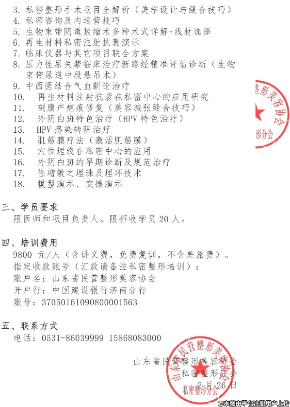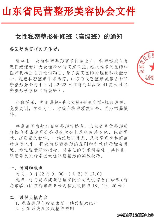 女性私密整形研修班(高級班)的通知