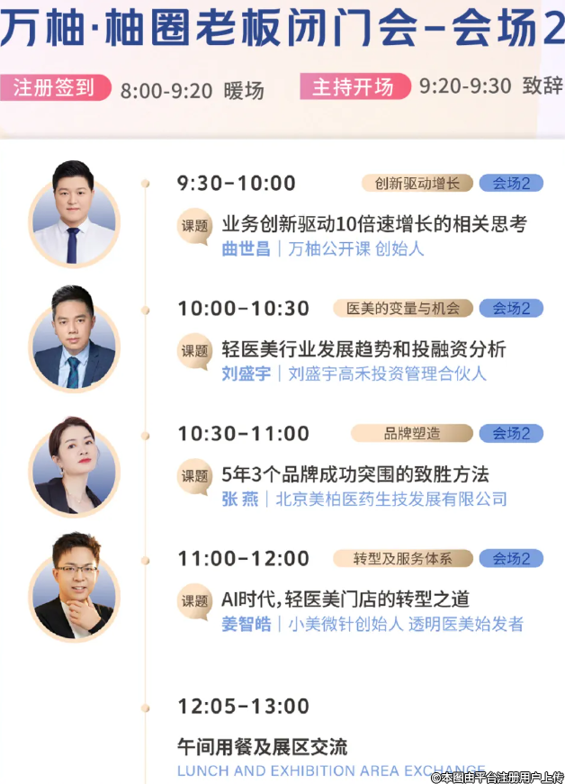 本次大會(huì)以“共赴理想醫(yī)美”為主題,開設(shè)注射與微整形創(chuàng)新、皮膚美容創(chuàng)新、私密維養(yǎng)與抗衰創(chuàng)新、柚圈老板閉門會(huì)、中醫(yī)美容創(chuàng)新、萬柚·美麗薈底層邏輯訓(xùn)練營等多個(gè)論壇、匯聚全國醫(yī)美領(lǐng)域權(quán)威專家,醫(yī)美行業(yè)經(jīng)營領(lǐng)袖,繼續(xù)秉承往屆的成功經(jīng)驗(yàn),為行業(yè)內(nèi)的專家學(xué)者和企業(yè)家提供一個(gè)深度交流、思想碰撞的平臺(tái),推動(dòng)醫(yī)美產(chǎn)業(yè)的創(chuàng)新發(fā)展。