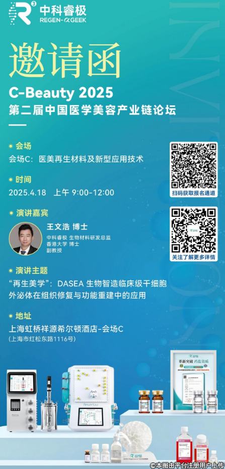 2025年4月17-18日,C-Beauty 2025 第二屆中國(guó)醫(yī)學(xué)美容產(chǎn)業(yè)鏈論壇將在上海盛大召開(kāi),作為中國(guó)細(xì)胞與基因治療產(chǎn)業(yè)(CGT)上游干細(xì)胞培養(yǎng)解決方案的龍頭企業(yè)應(yīng)邀參加本次大會(huì),中科睿極生物材料研發(fā)總監(jiān)、副教授王文浩博士將于4月18日在會(huì)場(chǎng)C作《“再生美學(xué)”:DASEA生物智造臨床級(jí)干細(xì)胞外泌體在組織修復(fù)與功能重建中的應(yīng)用》的學(xué)術(shù)報(bào)告。