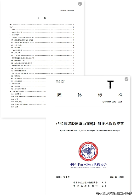 膠原蛋白注射市場快速增長,其應(yīng)用范圍日益拓展,需要臨床操作加快標準化進程。基于此背景,2024年7月,《組織提取膠原蛋白面部注射技術(shù)操作規(guī)范》團體標準(T/CNMIA 0043-2024)正式發(fā)布(以下簡稱“團體標準”),成為行業(yè)內(nèi)首個針對提取膠原蛋白面部注射技術(shù)的權(quán)威指南,標志著注射膠原蛋白行業(yè)進入標準化發(fā)展階段。