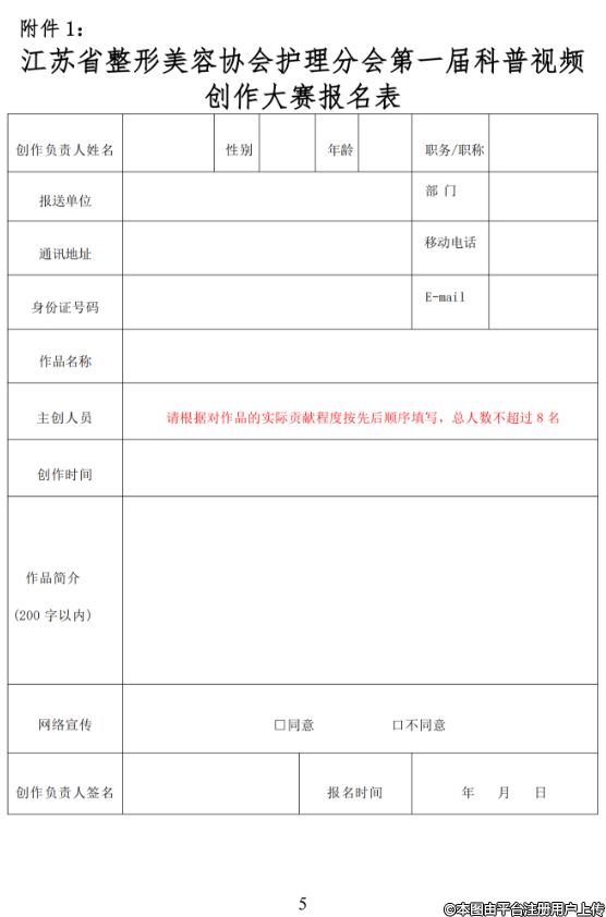 將報(bào)名表(附件 1)、簽字及蓋章后的作品版權(quán)承諾書(附件 2)和參賽作品壓縮打包發(fā)至指定郵箱:498700408@gg.com。郵件命名:醫(yī)院+姓名+作品題目。