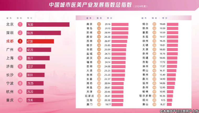 從城市醫(yī)美產(chǎn)業(yè)綜合指數(shù)看,北京、深圳分列第一、第二位。成都排名第三,較2023年度上升一位。官遠(yuǎn)星表示,圍繞“醫(yī)美之都”建設(shè),成都通過政策支持、城市特質(zhì)、經(jīng)濟(jì)發(fā)展、產(chǎn)業(yè)升級等外部引導(dǎo)和保障,醫(yī)美產(chǎn)業(yè)持續(xù)發(fā)展壯大,已經(jīng)成為構(gòu)建現(xiàn)代產(chǎn)業(yè)體系的重要優(yōu)勢賽道。