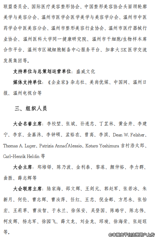 協(xié)辦單位:中國生物工程學會、中國國際商會絲路工委會、上合國家數(shù)字醫(yī)學發(fā)展中心工作委員會、世界內(nèi)鏡醫(yī)師協(xié)會中國整形外科聯(lián)盟委員會、國際醫(yī)療美容整形協(xié)會、中國整形美容協(xié)會頭面頸輪美學與美容分會、溫州市醫(yī)學會醫(yī)學美學與美容學分會、溫州市中醫(yī)藥學會中醫(yī)美容分會、溫州市整形美容行業(yè)協(xié)會、溫州市醫(yī)療器械行業(yè)協(xié)會、溫州醫(yī)科大學同一健康研究院、溫州市千細胞/生物樣本庫合作平臺、溫州市區(qū)域細胞制備中心服務平臺、加拿大SK醫(yī)學交流發(fā)展集團等,