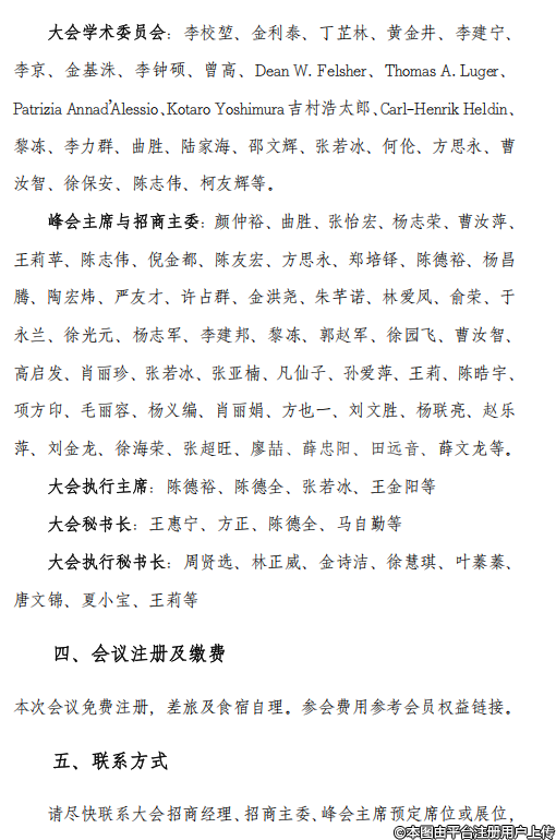 峰會主席與招商主委:顏仲裕、曲勝、張怡宏、楊志榮、曹汝萍王莉蘋、陳志偉、倪金都、陳友宏、方思永、鄭培鐸、陳德裕、楊昌騰、陶宏煒、嚴友才、許占群、金洪堯、朱芊諾、林愛鳳、俞榮、于永蘭、徐光元、楊志軍、李建邦、黎凍、郭趙軍、徐園飛、曹汝智高啟發(fā)、肖麗珍、張若冰、張亞楠、凡仙子、孫愛萍、王莉、陳晧宇項方印、毛麗容、楊義編、肖麗娟、方也一、劉文勝、楊聯(lián)亮、趙樂萍、劉金龍、徐海榮、張超旺、廖喆、薛忠陽、田遠音、薛文龍等,大會執(zhí)行主席:陳德裕、陳德全、張若冰、王金陽等大會秘書長:王惠寧、方正、陳德全、馬自勤等