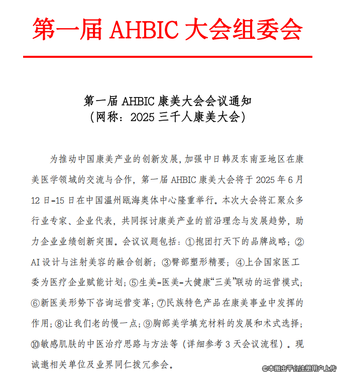 為推動中國康美產(chǎn)業(yè)的創(chuàng)新發(fā)展,加強中日韓及東南亞地區(qū)在康美醫(yī)學領域的交流與合作,第一屆 AHBIC 康美大會將于2025 年6月12 日-15 日在中國溫州甌海奧體中心隆重舉行。本次大會將匯聚眾多行業(yè)專家、企業(yè)代表,共同探討康美產(chǎn)業(yè)的前沿理念與發(fā)展趨勢,助力企業(yè)業(yè)績創(chuàng)新突圍。會議議題包括:①抱團打天下的品牌戰(zhàn)略;②AI設計與注射美容的融合創(chuàng)新;③臀部塑形精要:4上合國家醫(yī)工委為醫(yī)療企業(yè)賦能計劃:⑤生美-醫(yī)美-大健康“三美”聯(lián)動的運營模式:⑥新醫(yī)美形勢下咨詢運營變革;⑦民族特色產(chǎn)品在康美事業(yè)中發(fā)揮的作用;⑧讓我們老的慢一點;⑨胸部美學填充材料的發(fā)展和術式選擇⑩敏感肌膚的中醫(yī)治療思路與方法等(詳細參考3天會議流程)。現(xiàn)誠邀相關單位及業(yè)界同仁撥冗參會。