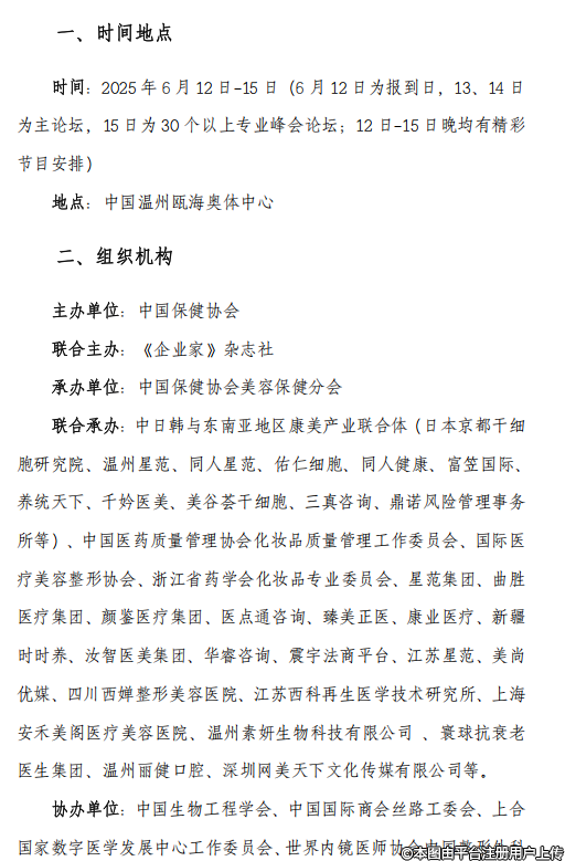 聯(lián)合承辦:中日韓與東南亞地區(qū)康美產(chǎn)業(yè)聯(lián)合體(日本京都千細胞研究院、溫州星范、同人星范、佑仁細胞、同人健康、富笠國際、養(yǎng)統(tǒng)天下、千妗醫(yī)美、美谷薈千細胞、三真咨詢、鼎諾風險管理事務所等)、中國醫(yī)藥質量管理協(xié)會化妝品質量管理工作委員會、國際醫(yī)療美容整形協(xié)會、浙江省藥學會化妝品專業(yè)委員會、星范集團、曲勝醫(yī)療集團、顏鑒醫(yī)療集團、醫(yī)點通咨詢、臻美正醫(yī)、康業(yè)醫(yī)療、新疆時時養(yǎng)、汝智醫(yī)美集團、華睿咨詢、震宇法商平臺、江蘇星范、美尚優(yōu)媒、四川西嬋整形美容醫(yī)院、江蘇西科再生醫(yī)學技術研究所、上海安禾美閣醫(yī)療美容醫(yī)院、溫州素妍生物科技有限公司、寰球抗衰老醫(yī)生集團、溫州麗健口腔、深圳網(wǎng)美天下文化傳媒有限公司等。