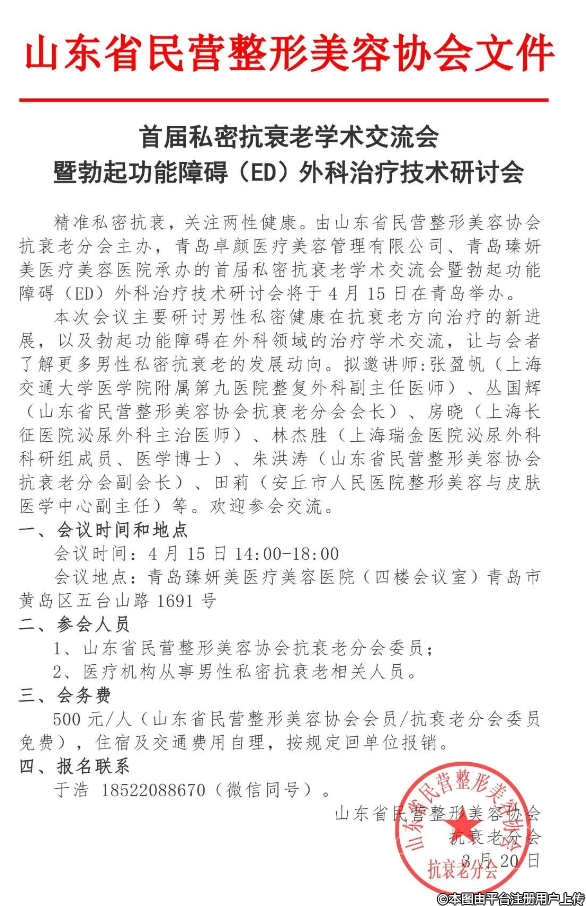 精準私密抗衰,關(guān)注兩性健康。由山東省民營整形美容協(xié)會抗衰老分會主辦,青島卓顏醫(yī)療美容管理有限公司、青島瑧妍美醫(yī)療美容醫(yī)院承辦的首屆私密抗衰老學(xué)術(shù)交流會暨勃起功能障礙(ED)外科治療技術(shù)研討會將于4月15日在青島舉辦。
