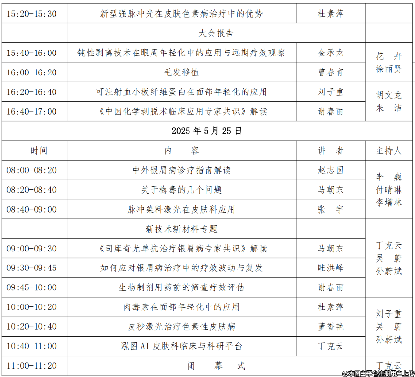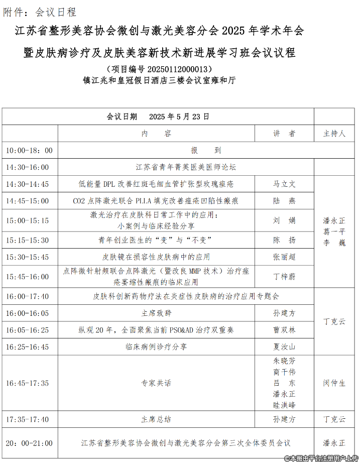 為發(fā)揮江蘇省整形美容協(xié)會微創(chuàng)與激光美容分會的引領(lǐng)作用,推動我省醫(yī)療美容皮膚與激光美容事業(yè)的發(fā)展,經(jīng)協(xié)會研究,由江蘇省整形美容協(xié)會主辦、鎮(zhèn)江市第一人民醫(yī)院承辦的江蘇省整形美容協(xié)會微創(chuàng)與激光美容分會 2025 年學(xué)術(shù)年會暨皮膚病診療及皮膚美容新技術(shù)新進(jìn)展學(xué)習(xí)班(項目編號:20250112000013)定于2025年5月 23-24 日在鎮(zhèn)江召開?,F(xiàn)將會議有關(guān)事宜通知如下: