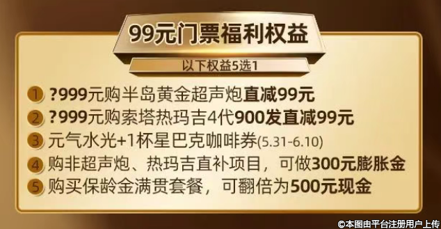 99元=占位半島黃金超聲炮超值福利價(jià),使用門(mén)票可直減99元。
