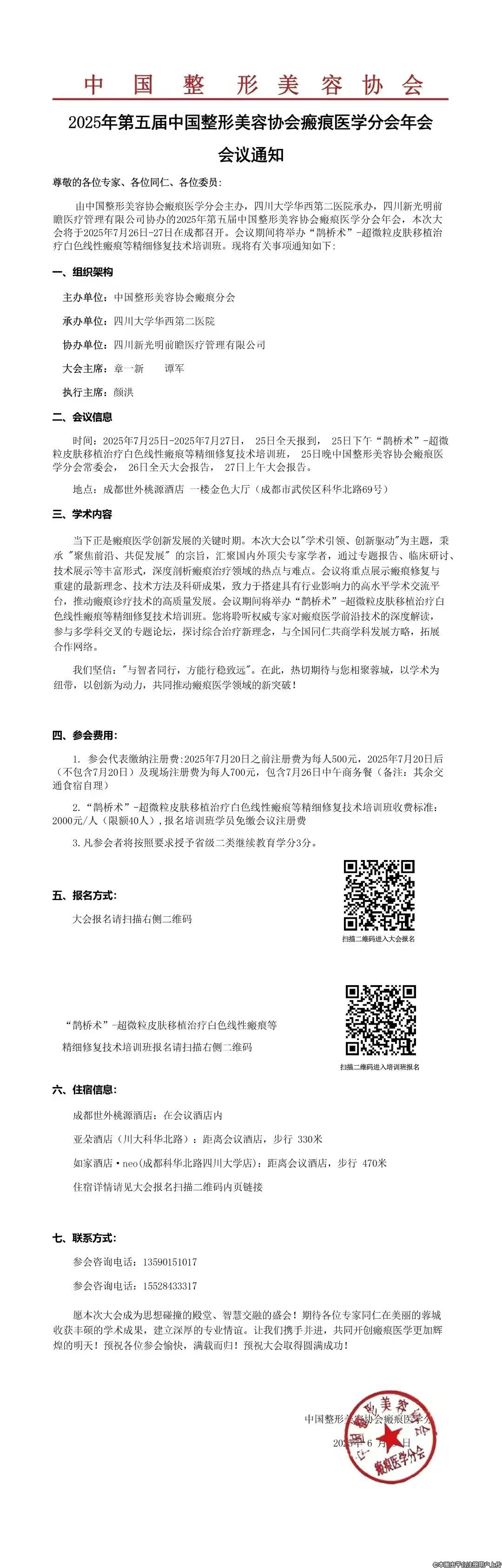 由中國(guó)整形美容協(xié)會(huì)瘢痕醫(yī)學(xué)分會(huì)主辦,四川大學(xué)華西第二醫(yī)院承辦,四川新光明前瞻醫(yī)療管理有限公司協(xié)辦的2025年第五屆中國(guó)整形美容協(xié)會(huì)瘢痕醫(yī)學(xué)分會(huì)年會(huì),本次大會(huì)將于2025年7月26日-27日在成都召開(kāi)。會(huì)議期間將舉辦“鵲橋術(shù)”-超微粒皮膚移植治療白色線(xiàn)性瘢痕等精細(xì)修復(fù)技術(shù)培訓(xùn)班。期待各位專(zhuān)家同仁共襄盛會(huì)。